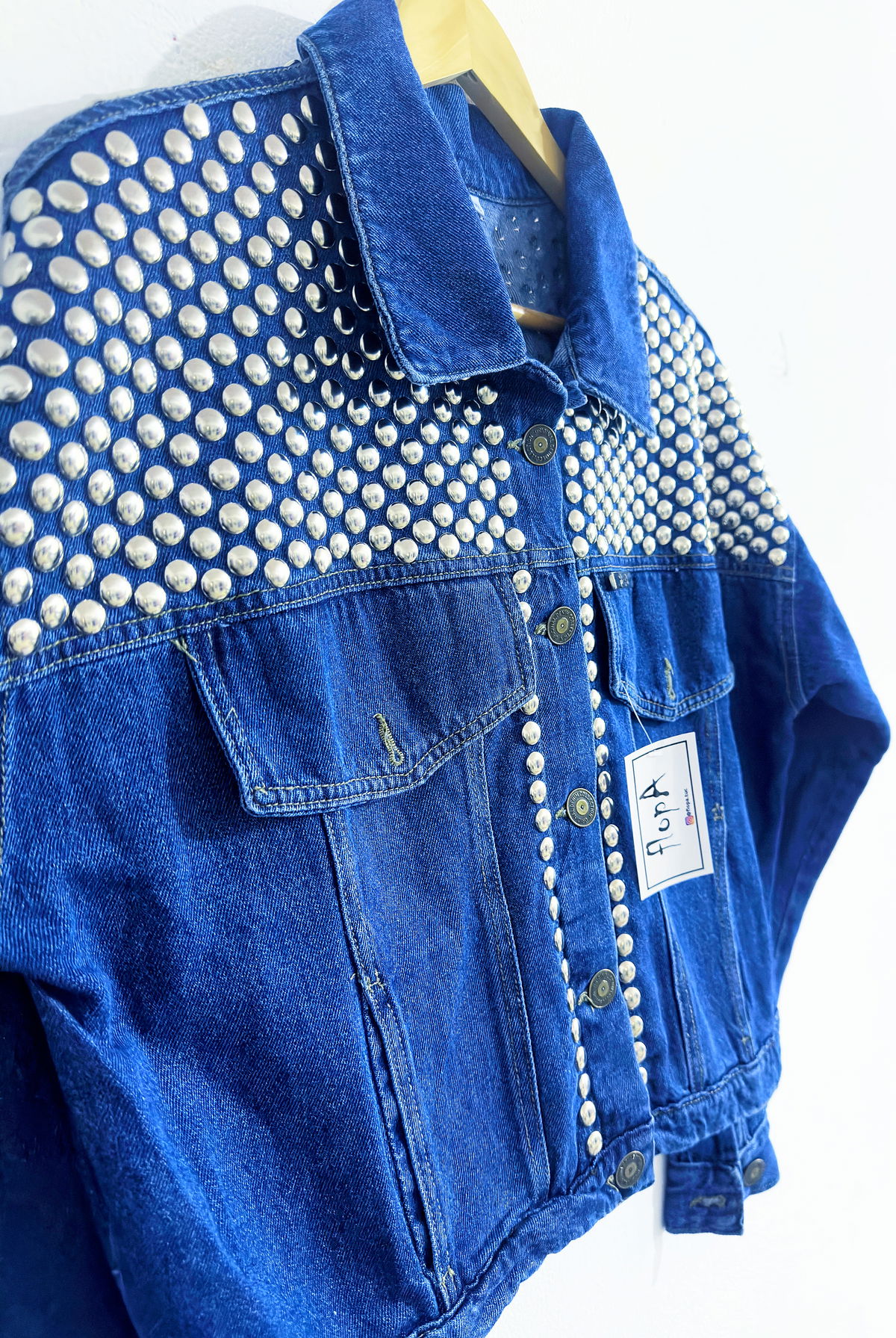 - Customizada con tachas plateadas colocadas a mano en frente y espalda