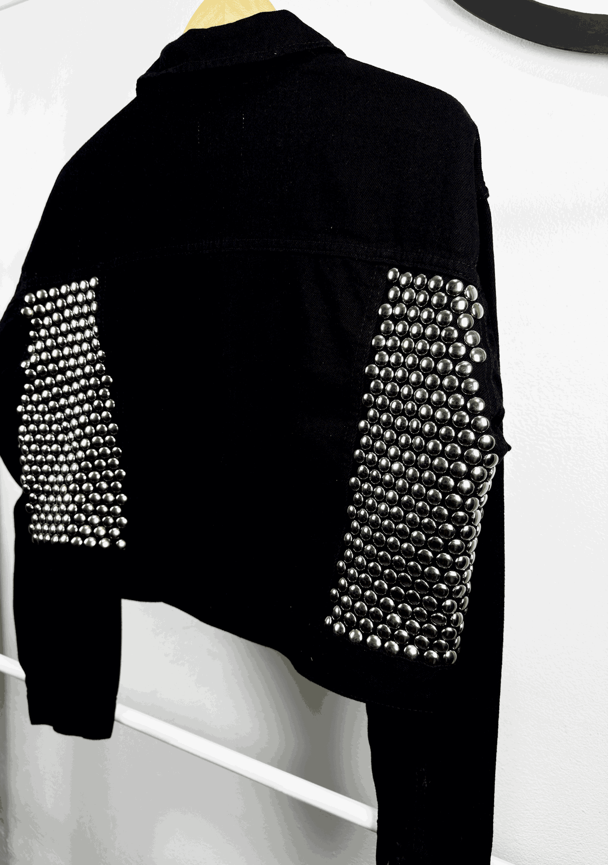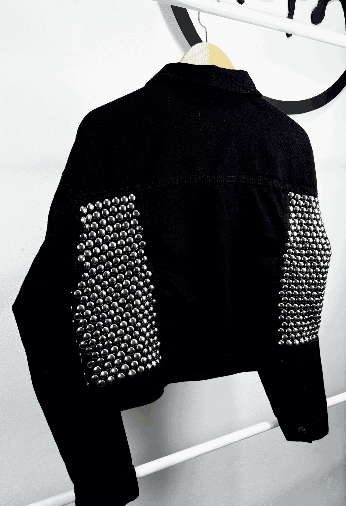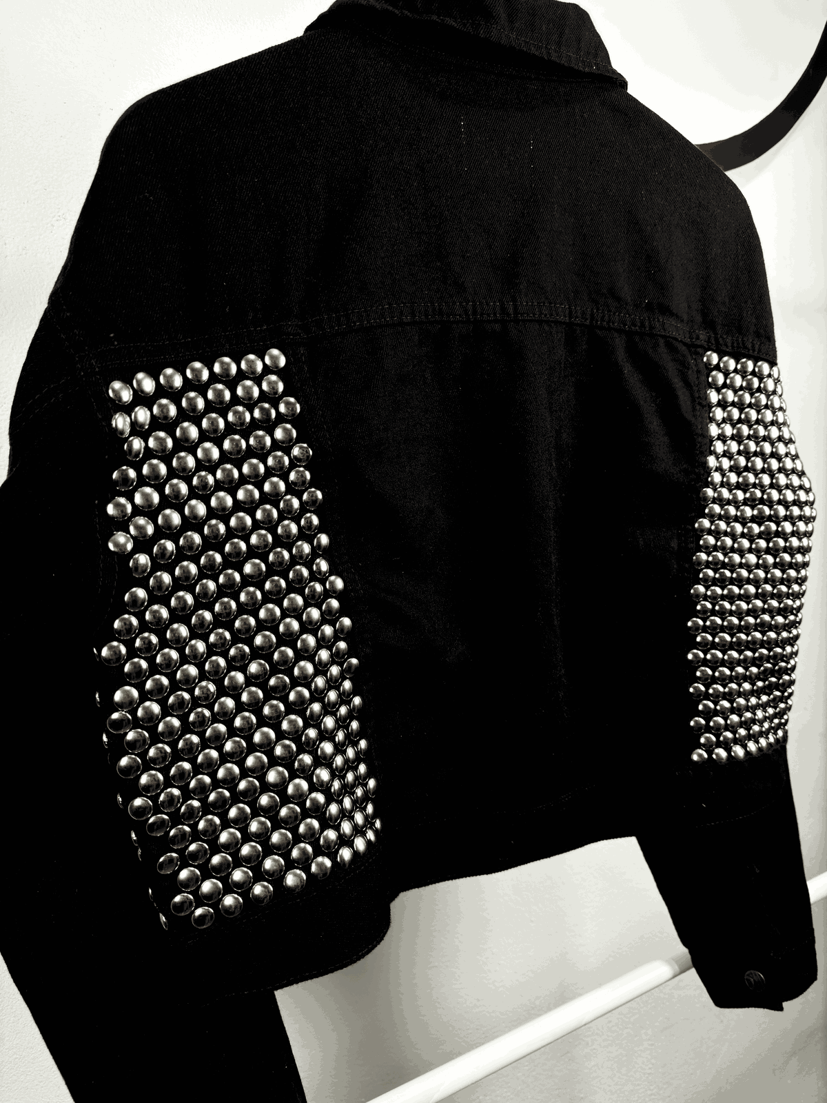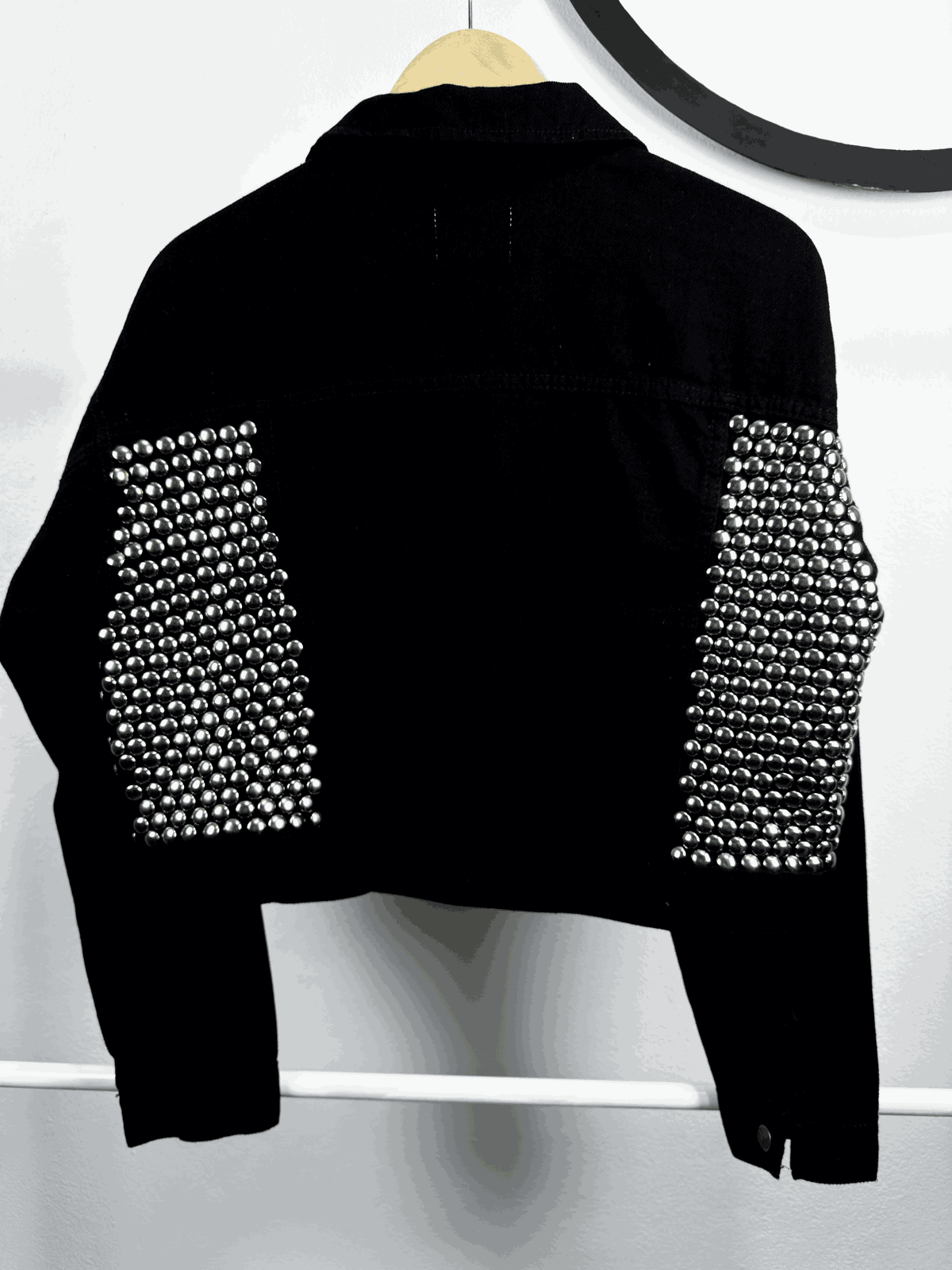 - Customizada con tachas plateadas colocadas a mano en frente y espalda de la campera