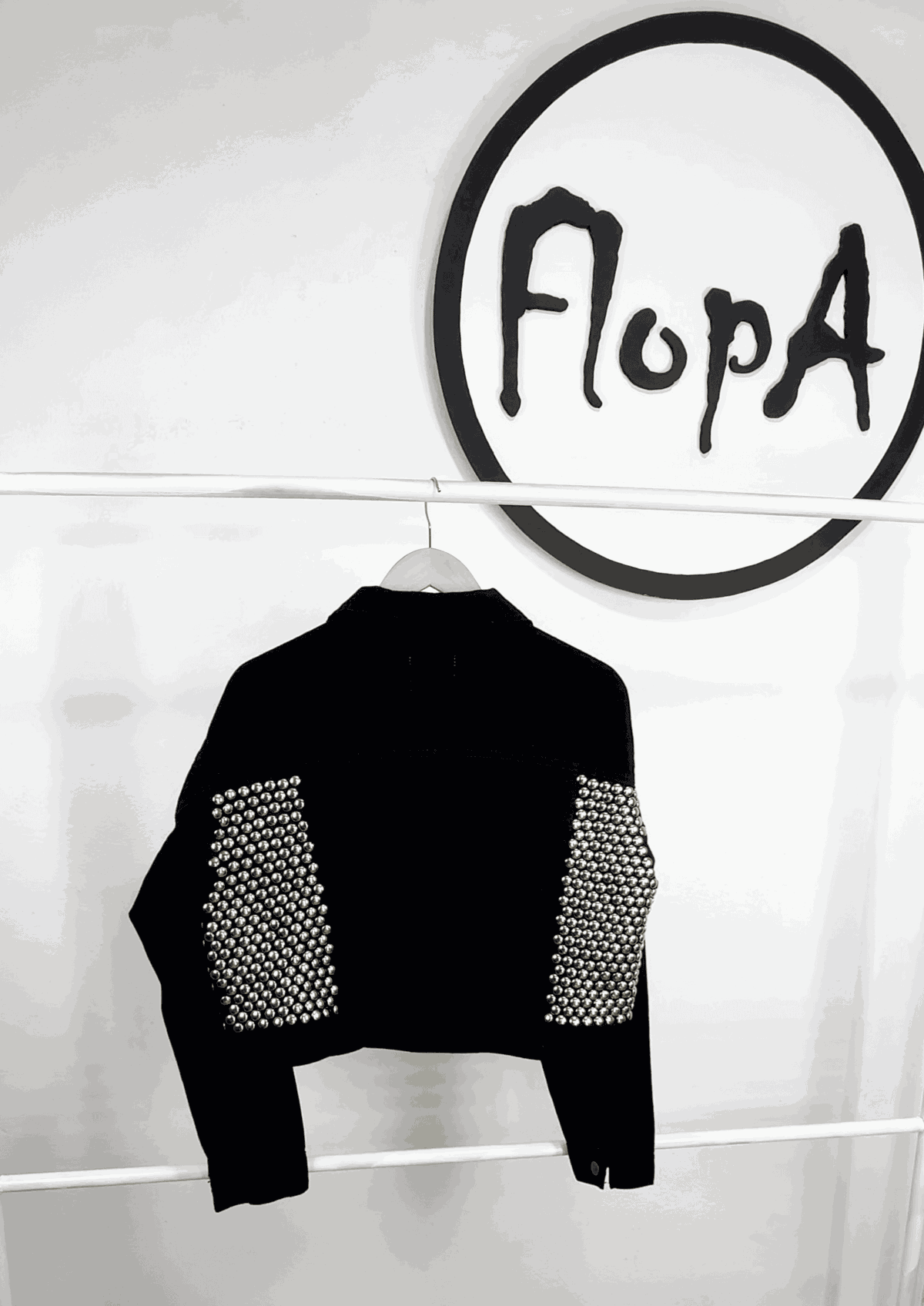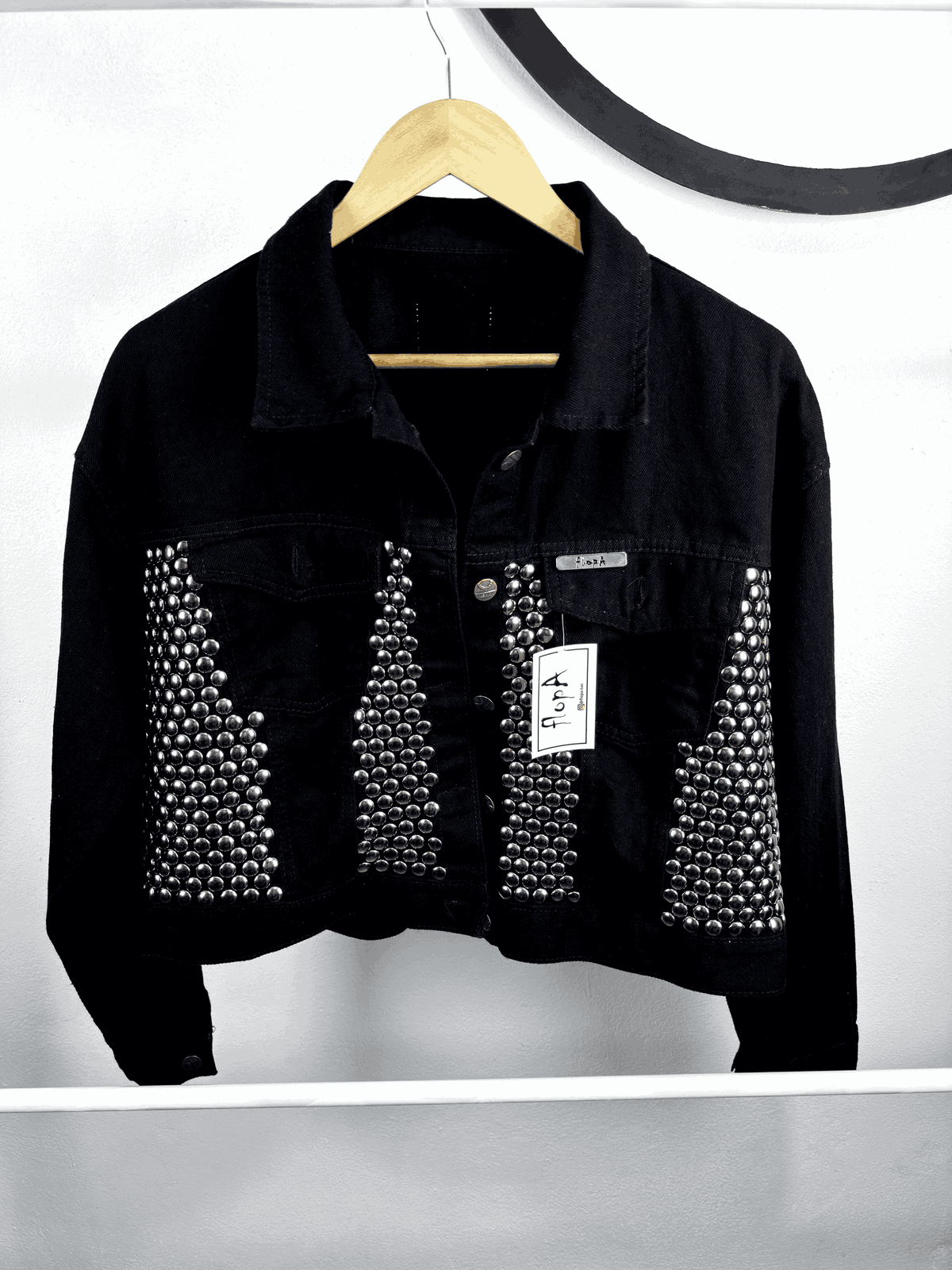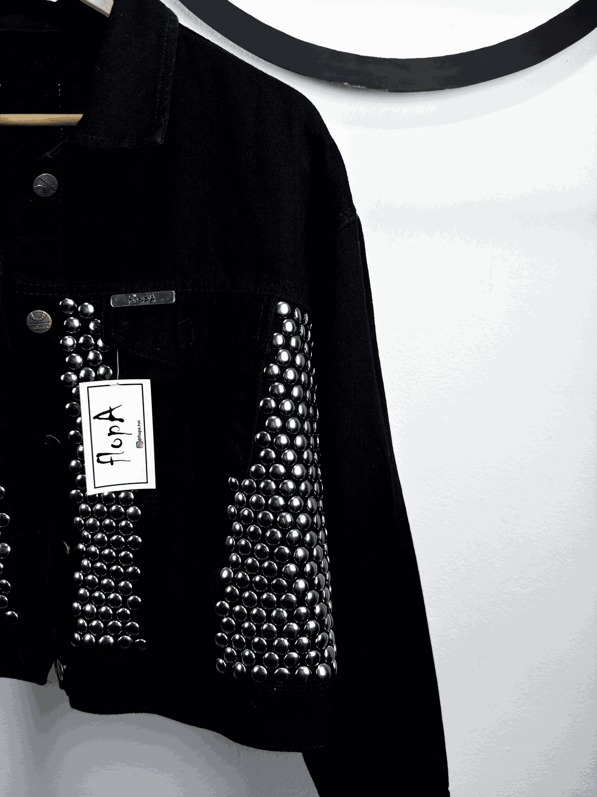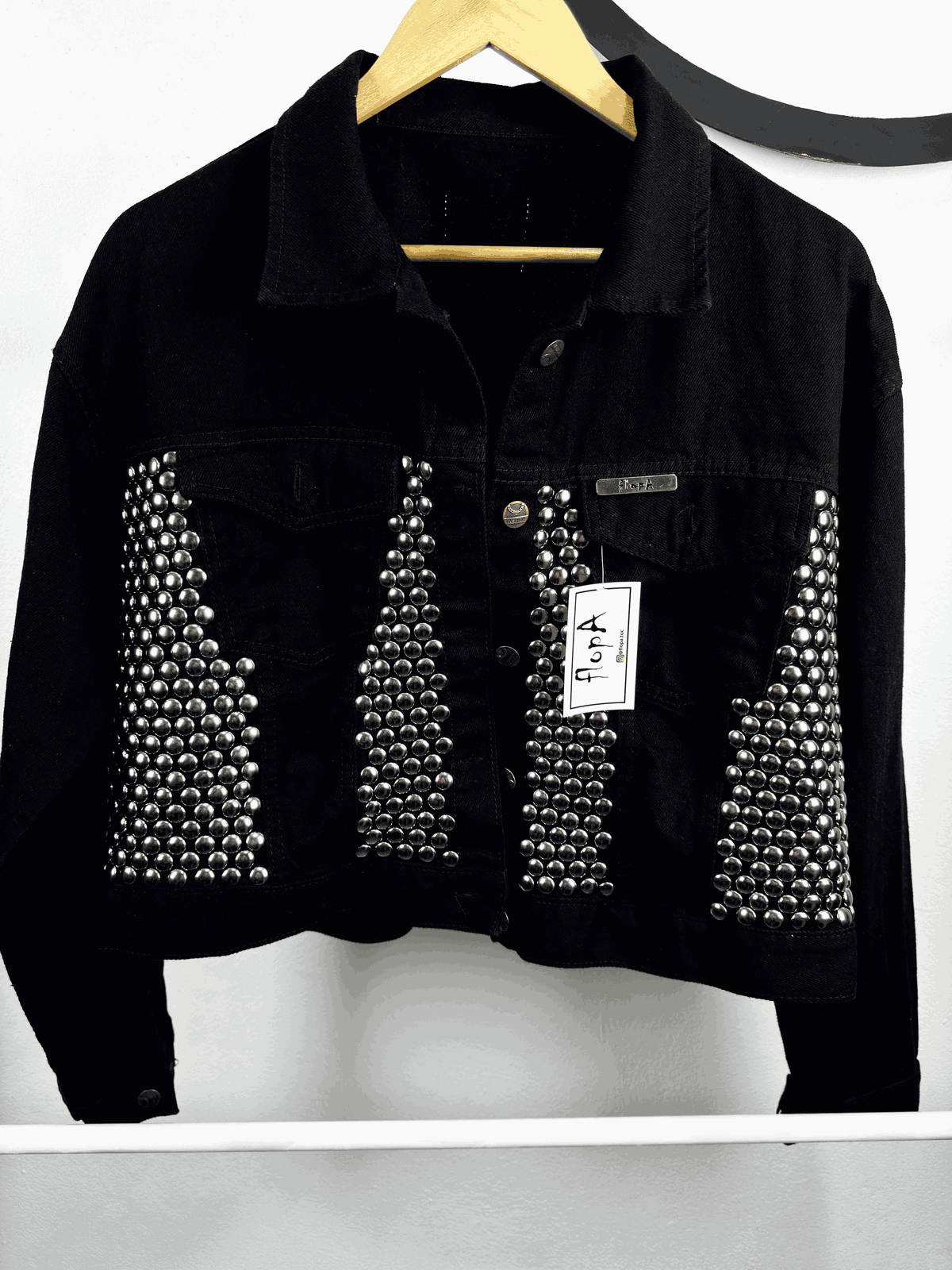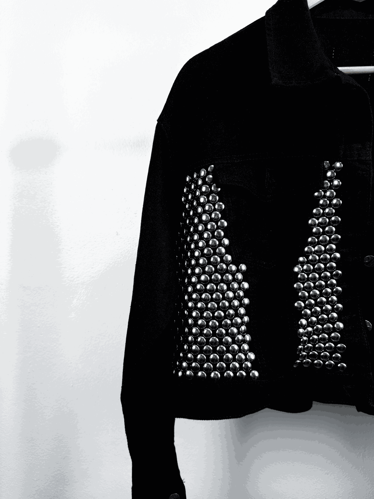 - Customizada con tachas plateadas colocadas a mano en frente y espalda de la campera