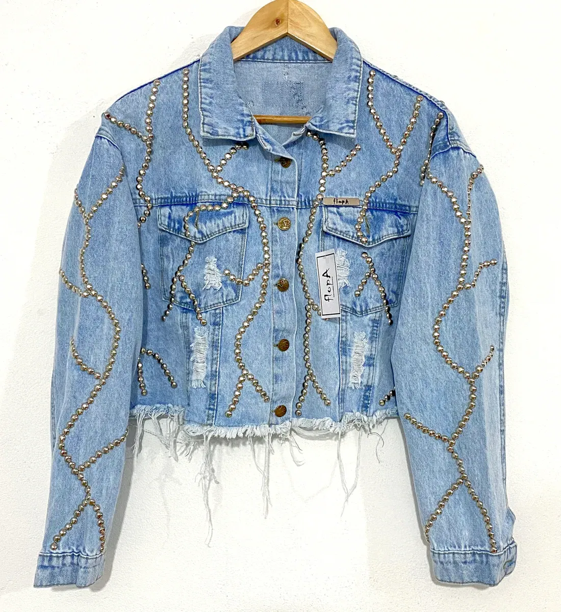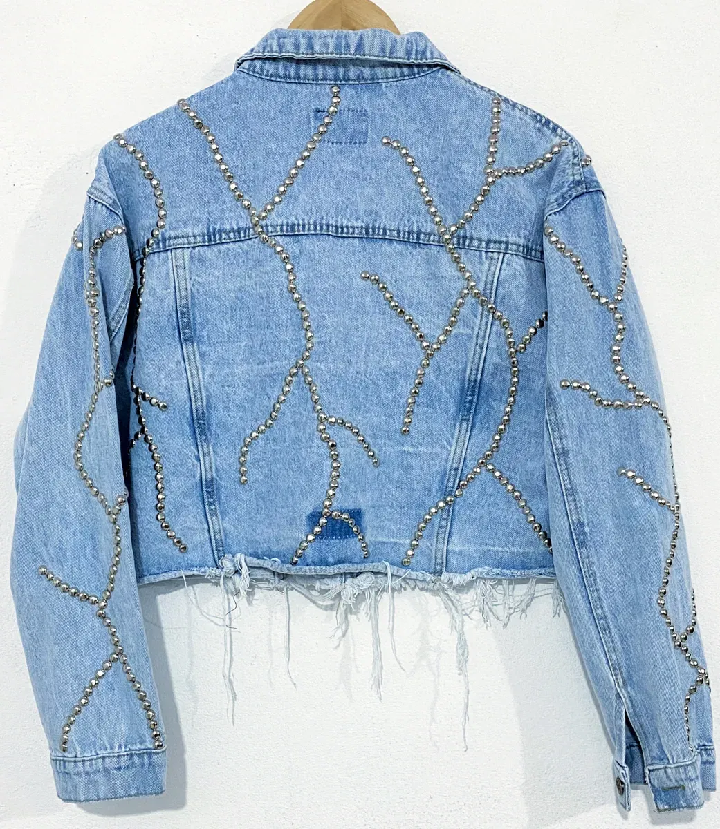 - Customizada con tachas plateadas colocadas a mano en frente, espalda y brazos de la campera